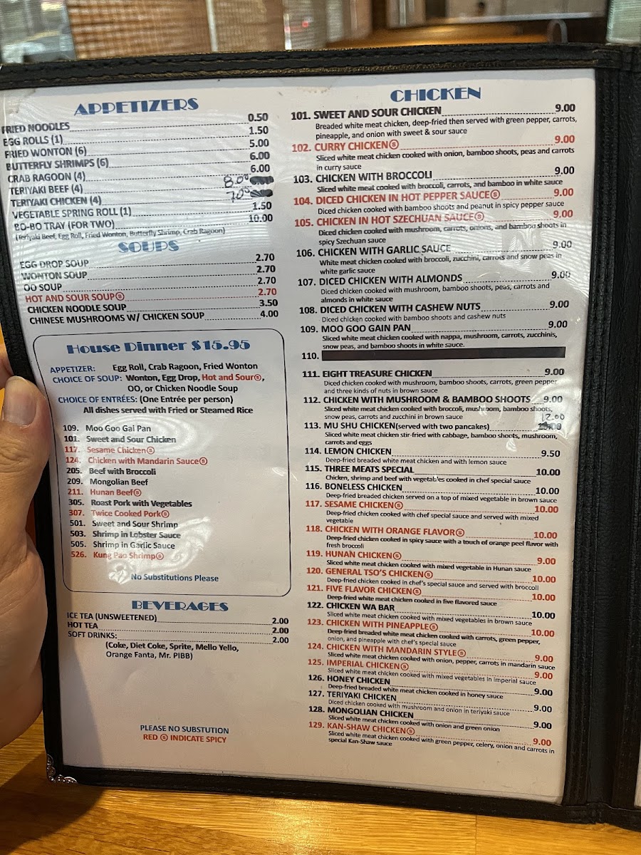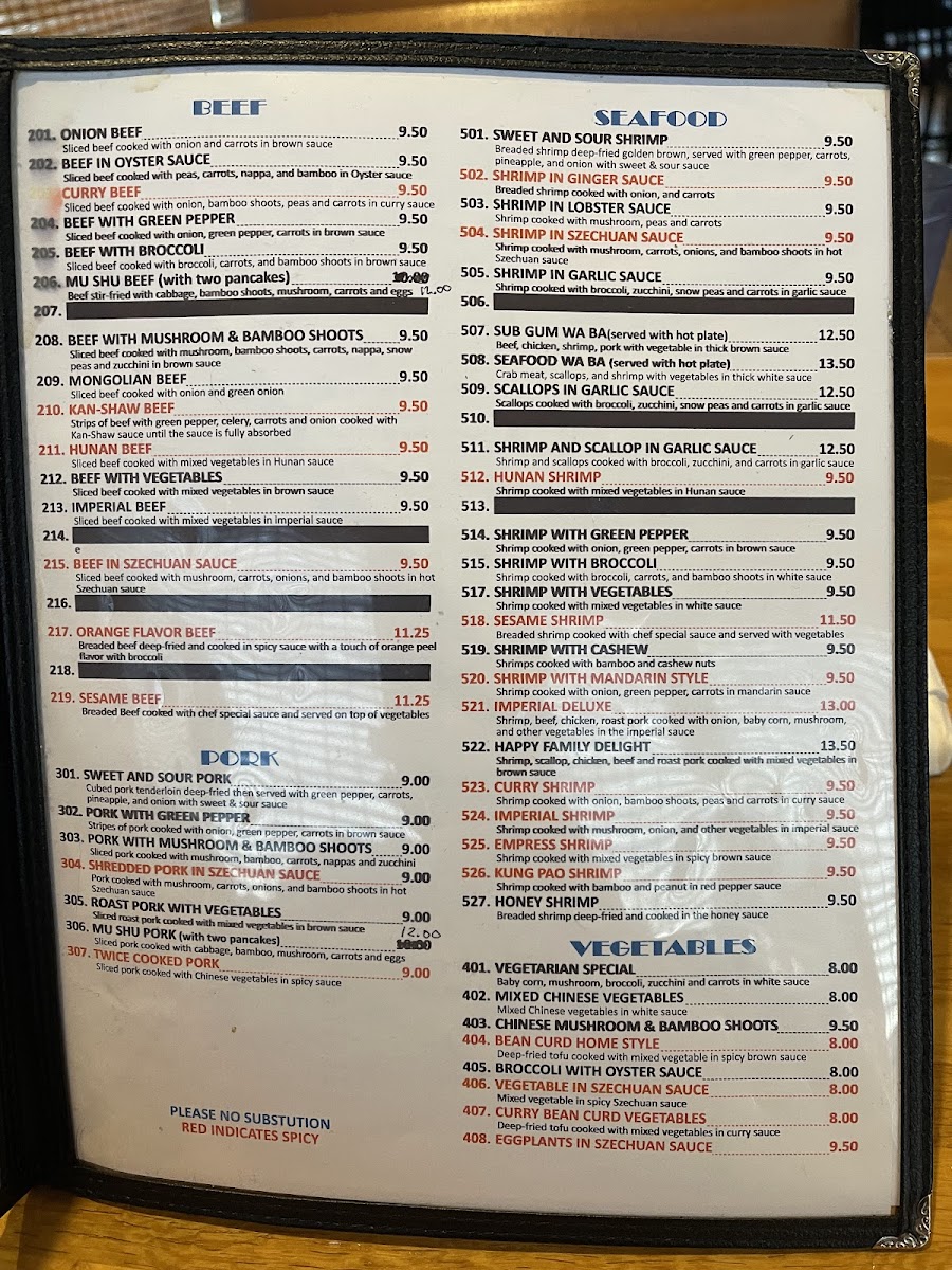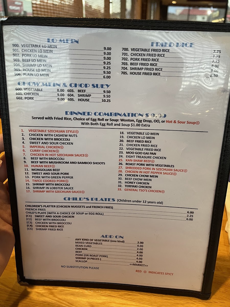 Seafood: Seafood offerings include shrimp prepared in different styles such as sweet and sour, ginger sauce, lobster sauce, and Szechuan sauce, catering to those preferring lighter or spiced seafood dishes.