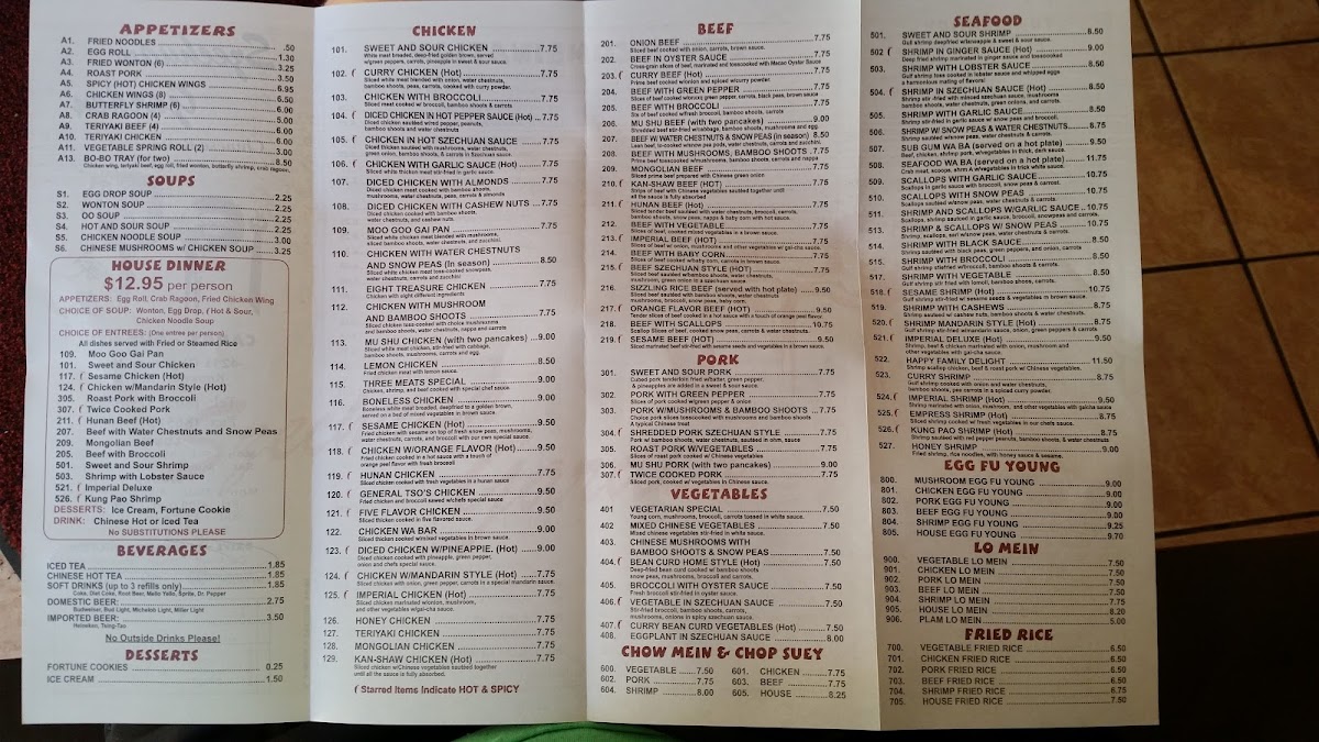 The menu at Szechuan Garden Chinese Restaurant offers a diverse selection of traditional Sichuan and American-Chinese dishes. It is structured into several main categories to accommodate a range of tastes and dining preferences.